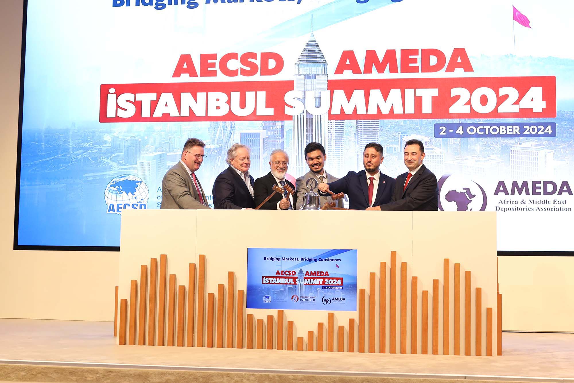 A special bell-ringing ceremony was held at Borsa İstanbul to commemorate the AECSD & AMEDA İstanbul Summit 2024. Distinguished participants included Mr. Ali İhsan GÜNGÖR, Executive Vice Chairman of the Capital Markets Board of Türkiye and Chairman of the Board of Directors of MKK; Dr. Ekrem ARIKAN, CEO & Board Member of MKK; Mr. Abdulla Jaffar ABDIN, President of AMEDA; Mr. Yedil MEDEU, President of the World Forum of CSDs; Mr. Colin PARRY, CEO of the International Securities Services Association (ISSA); and Mr. Bruce BUTTERILL, Executive Director of the Americas’ Central Securities Depositories Association.