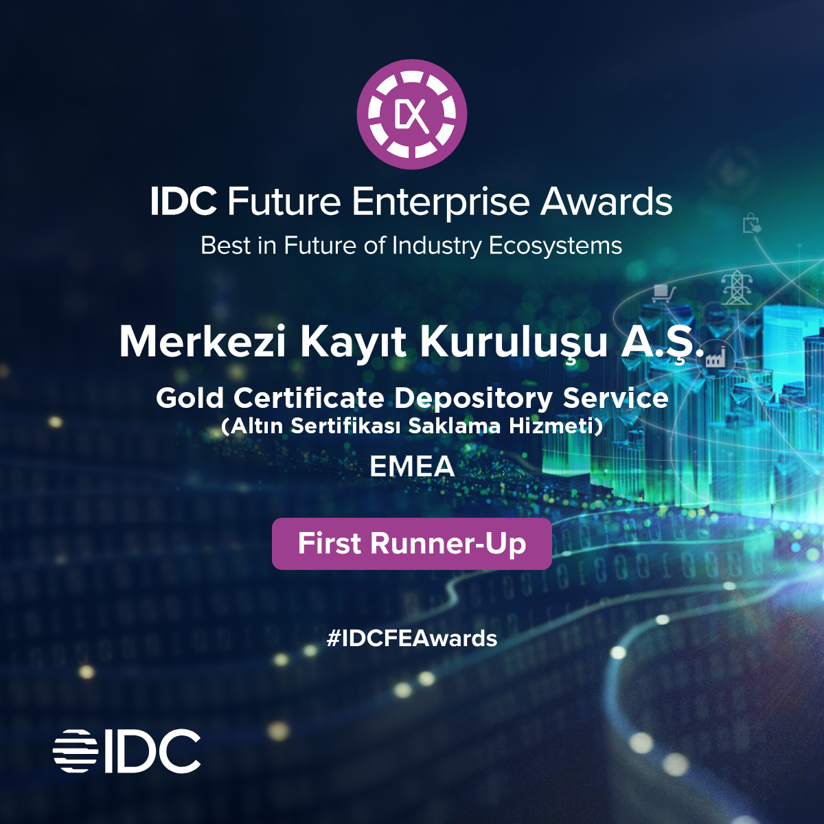 Merkezi Kayıt Kuruluşu (MKK) has been awarded the First Runner-Up prize in the “Best in Future of Industry Ecosystem” category at the IDC Future Enterprise Awards for its Gold Certificate Depository Service.