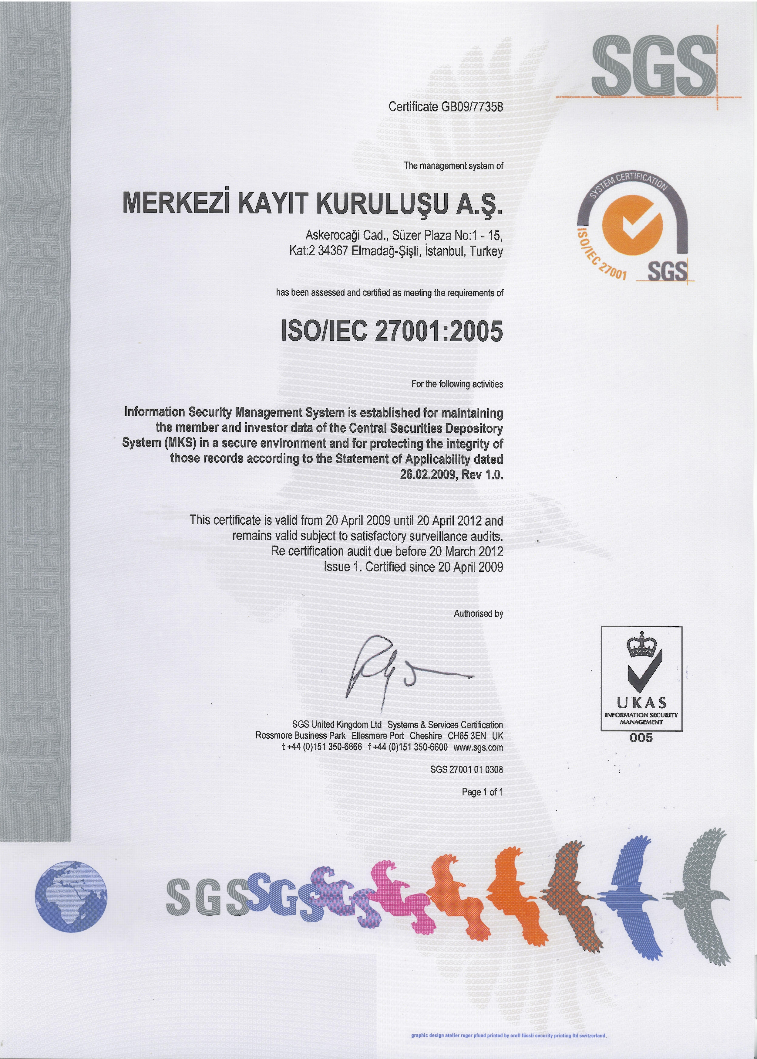 Sermaye Piyasası Kanunu ve ilgili mevzuat çerçevesinde, Kuruluşumuz tarafından sermaye piyasası araçları ve bunlara ilişkin hakların kayden izlenmesi ile ilgili olarak, Merkezi Kaydi Sistem (MKS) kayıtlarının güvenliğinin sağlanması amacıyla uygulanmakta olan bilgi güvenlik sistemimizin, uluslararası kabul gören ISO/IEC 27001:2005 Bilgi Güvenlik Yönetim Sistemi kapsamında sertifikaya bağlanması amacıyla bir süreden beri devam eden çalışmalar tamamlanmış bulunmaktadır.