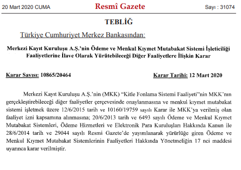 RESMİ GAZETE TEBLİĞ: Kitle Fonlaması Faaliyetlerinin MKK Faaliyetleri Arasına Eklenmesi